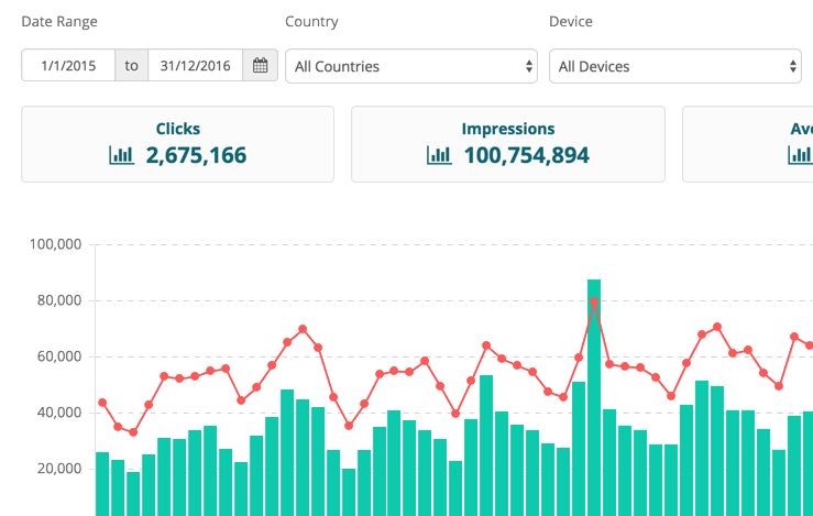 After a quick authorization process, you’ll be able to see up to 50,000 keywords your site is ranking for, along with clicks, impressions, CTR, and position. An unlimited ranking history is available, and you’ll even be able to compare side-by-side with Dragon Metrics’ ranking data. We’ll even use the queries you’re already getting traffic from on Google to suggest keywords to track in Dragon Metrics.