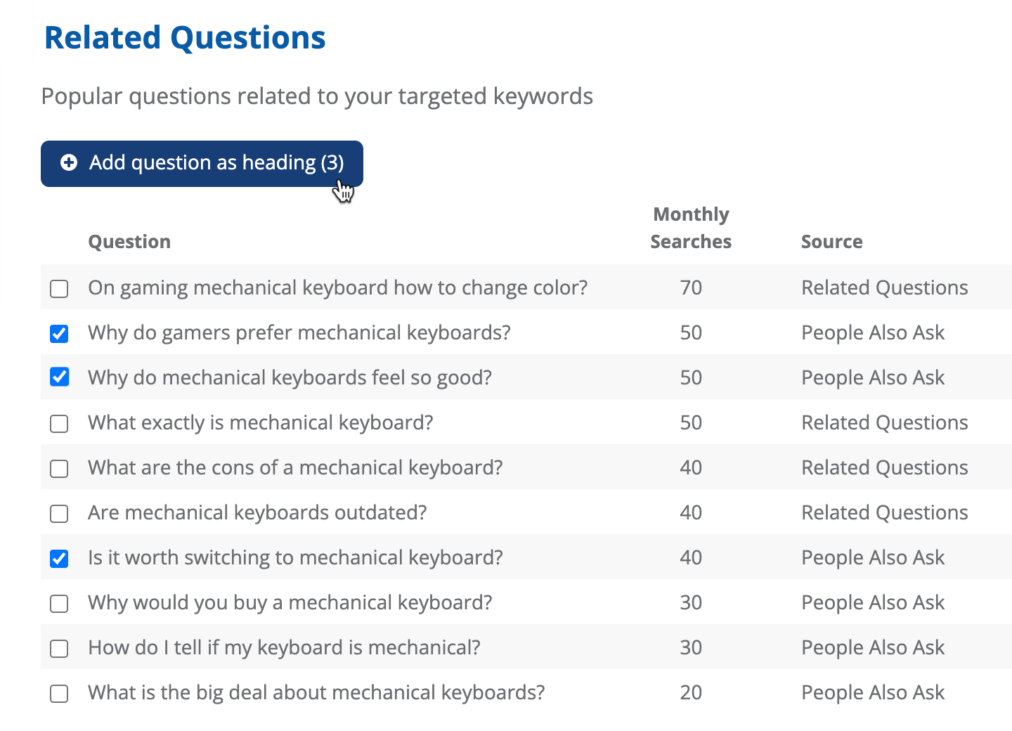 Keywords that 5 or more URLs ranking in the top 10 are also ranking for are shown in the Keyword Gap section, and can be quickly added to your existing content.