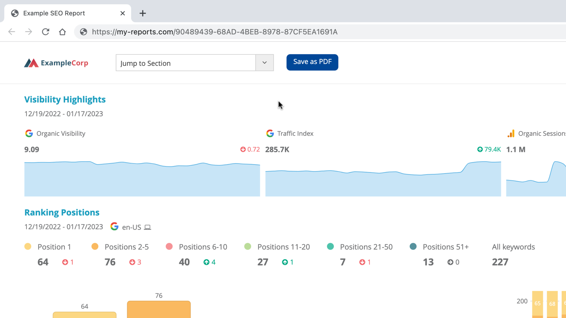 Over 90 modules covering all aspects of your SEO performance are available to be added to your report, including 30 Google Analytics and Google Search Console reports.