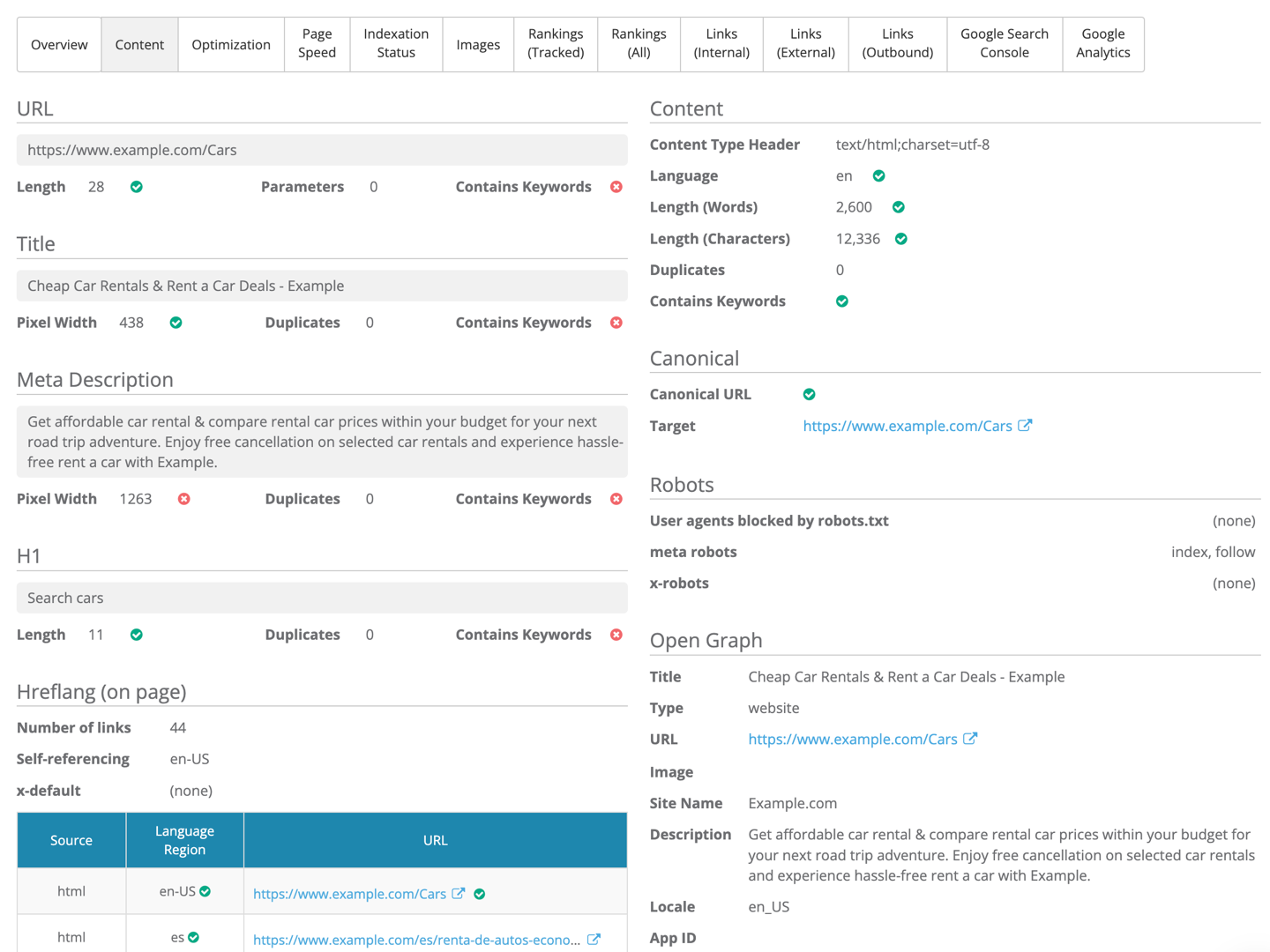 Instantly view on-page content, tracked and untracked keyword rankings, internal Pagerank, optimization issues, internal and external links, Google Search Console clicks and impressions, Google Analytics traffic and conversions, and so much more.